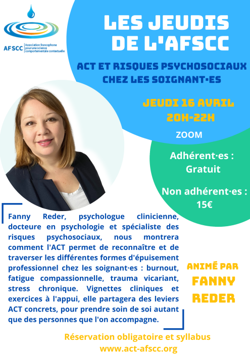Restez informé des prochains rendez-vous autour de l'ACT (Thérapie d'Acceptation et d'Engagement) grâce à notre calendrier d'événements variés. Parmi eux, les incontournables "Jeudis de l'AFSCC", des visioconférences organisées un jeudi par mois. Ces sessions en ligne réunissent des experts et praticiens du monde de l'ACT pour des échanges enrichissants, des discussions thématiques et des partages d'expériences.