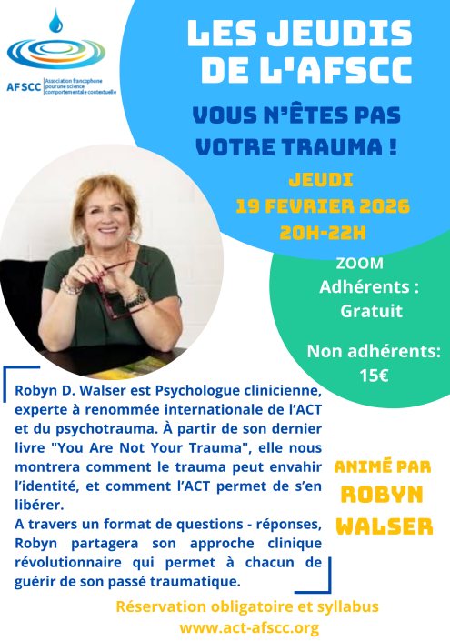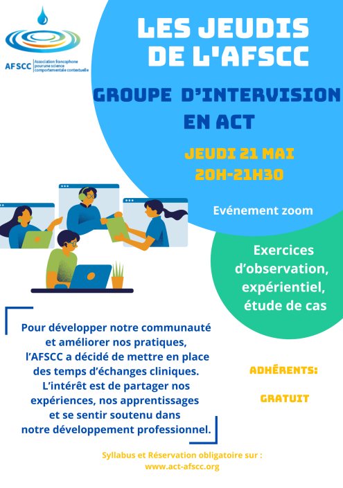 L'AFSCC est une association à but non lucratif dont l'objectif principal est de promouvoir l'ACT au sein des pays francophones. Nous organisons régulièrement des évènements afin de faire découvrir et aussi approfondir les savoirs sur l'ACT. Rejoignez notre communauté pour avoir accès aux différentes vidéos et outils ACT. Devenez adhérent et participez gratuitement aux Jeudis de l'AFSCC, bénéficiez de tarifs réduits sur les événements organisés par l'association. Rejoignez nous et participez à l'organisation et au rayonnement des Sciences Comportementales, Contextuelles et Fonctionnelles.