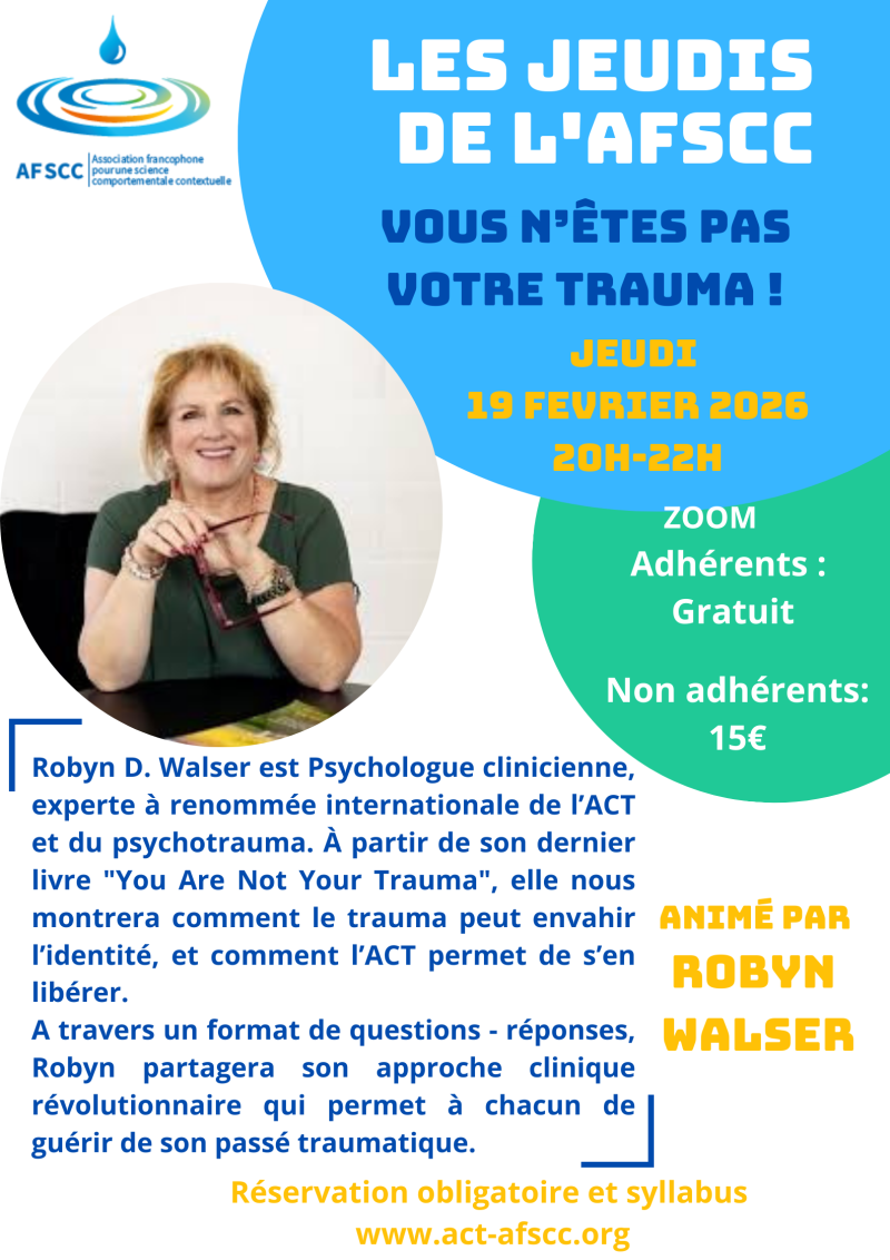 Au cours de cette conférence unique en français, Robyn Walser présentera les idées clés de son livre, récemment publié en anglais, en les rendant accessibles. Elle expliquera pourquoi le travail thérapeutique ne consiste pas à « effacer » le trauma, mais à aider la personne à se désidentifier de celui-ci, afin de retrouver une relation plus souple à ses pensées, émotions et sensations.