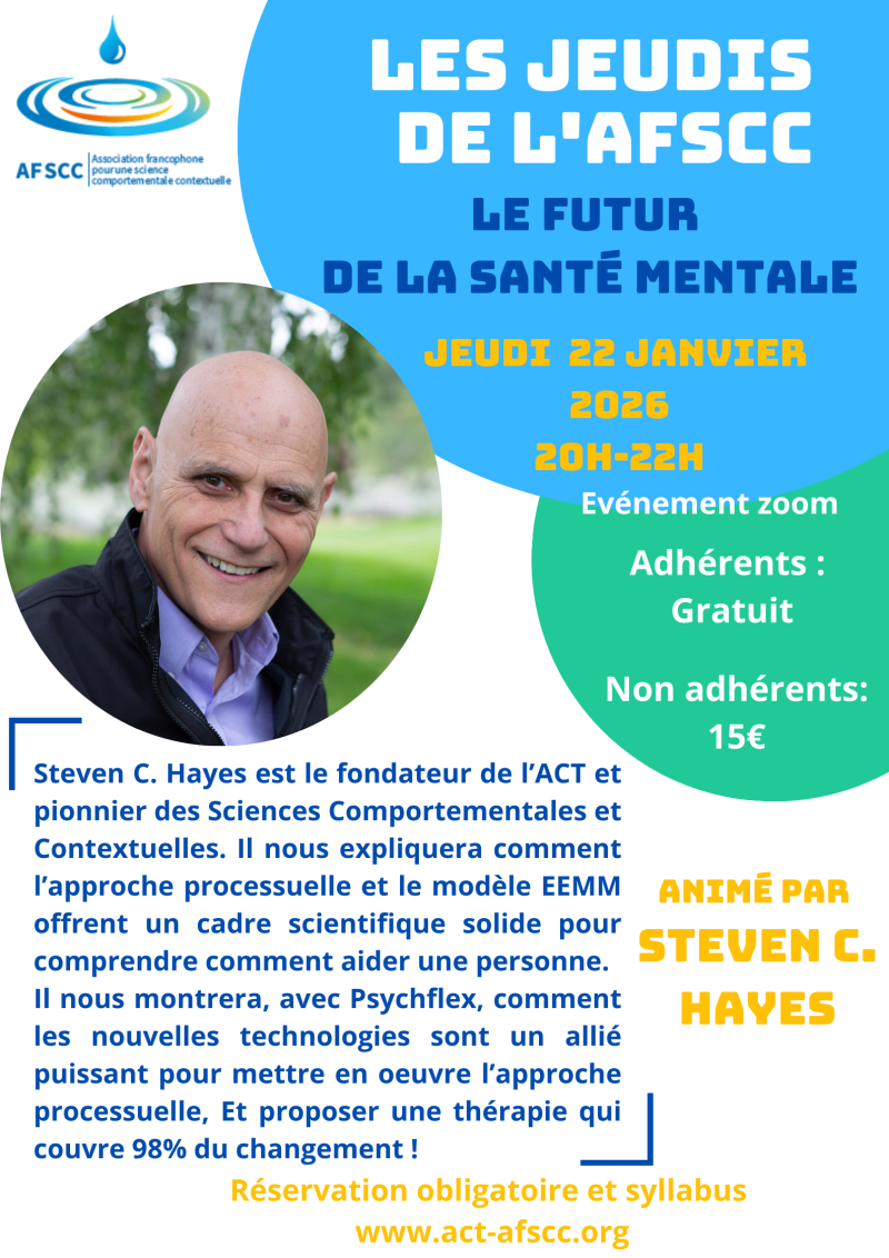 Dans cette conférence exceptionnelle, Steven C. Hayes, fondateur de l’ACT et pionnier des Sciences Comportementales et Contextuelles, presentera comment l’approche processuelle et le modèle EEMM offrent un cadre scientifique solide pour comprendre ce qui, réellement, fait évoluer une personne.